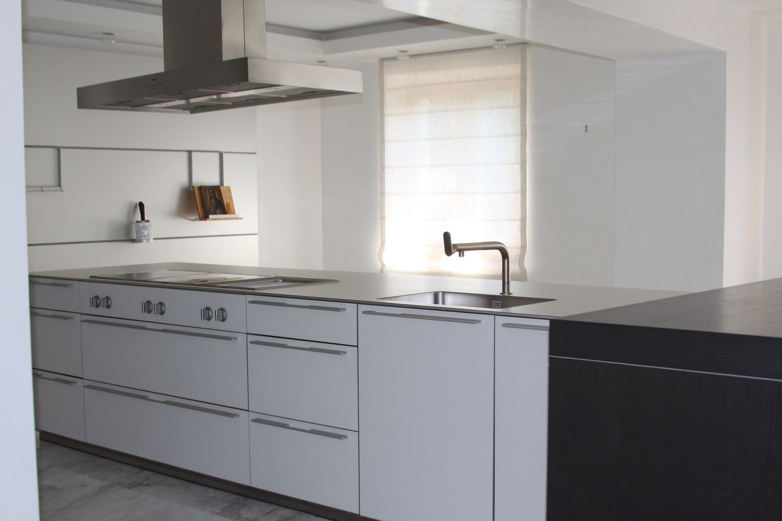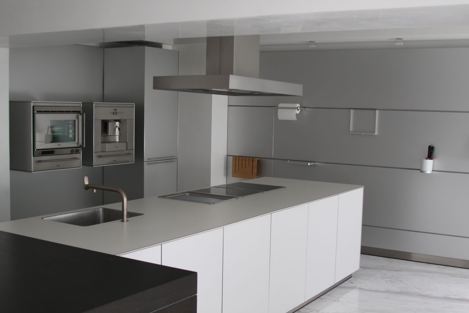 Кухня выполнена в виде острова с навесной техникой на стене фирмы БУЛЬТХАУП с встроенной техникой фирмы ГУГЕНАУ