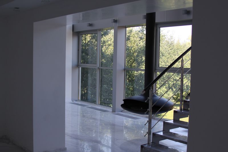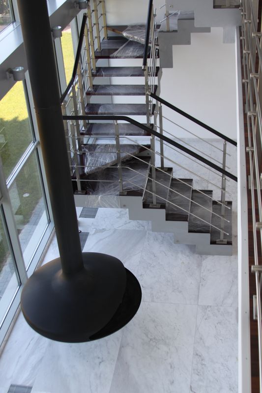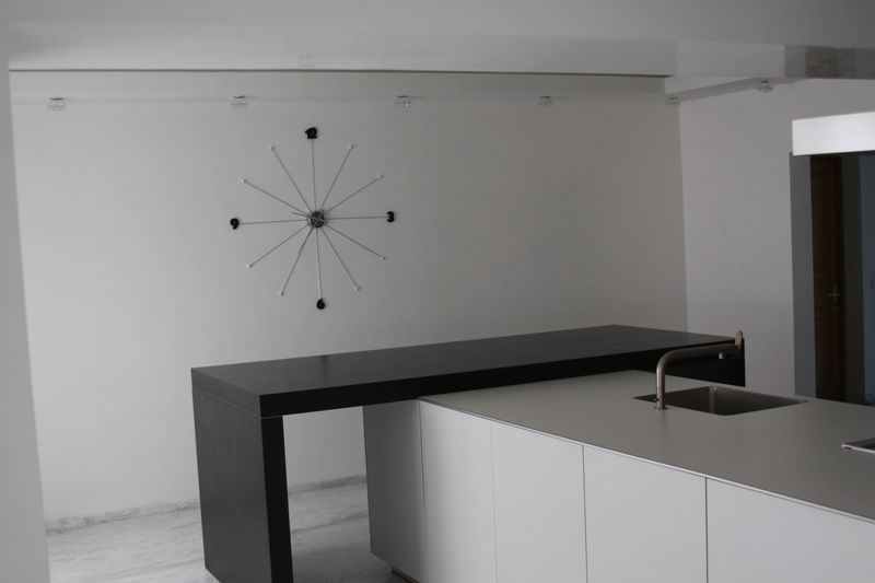 Стены выполнены венецианской росписью белого цвета с добавлением серебра. Пол с водяным подогревом покрытый белым греческим мрамором из вымирающего карьера КАРАРА БИАНКА.