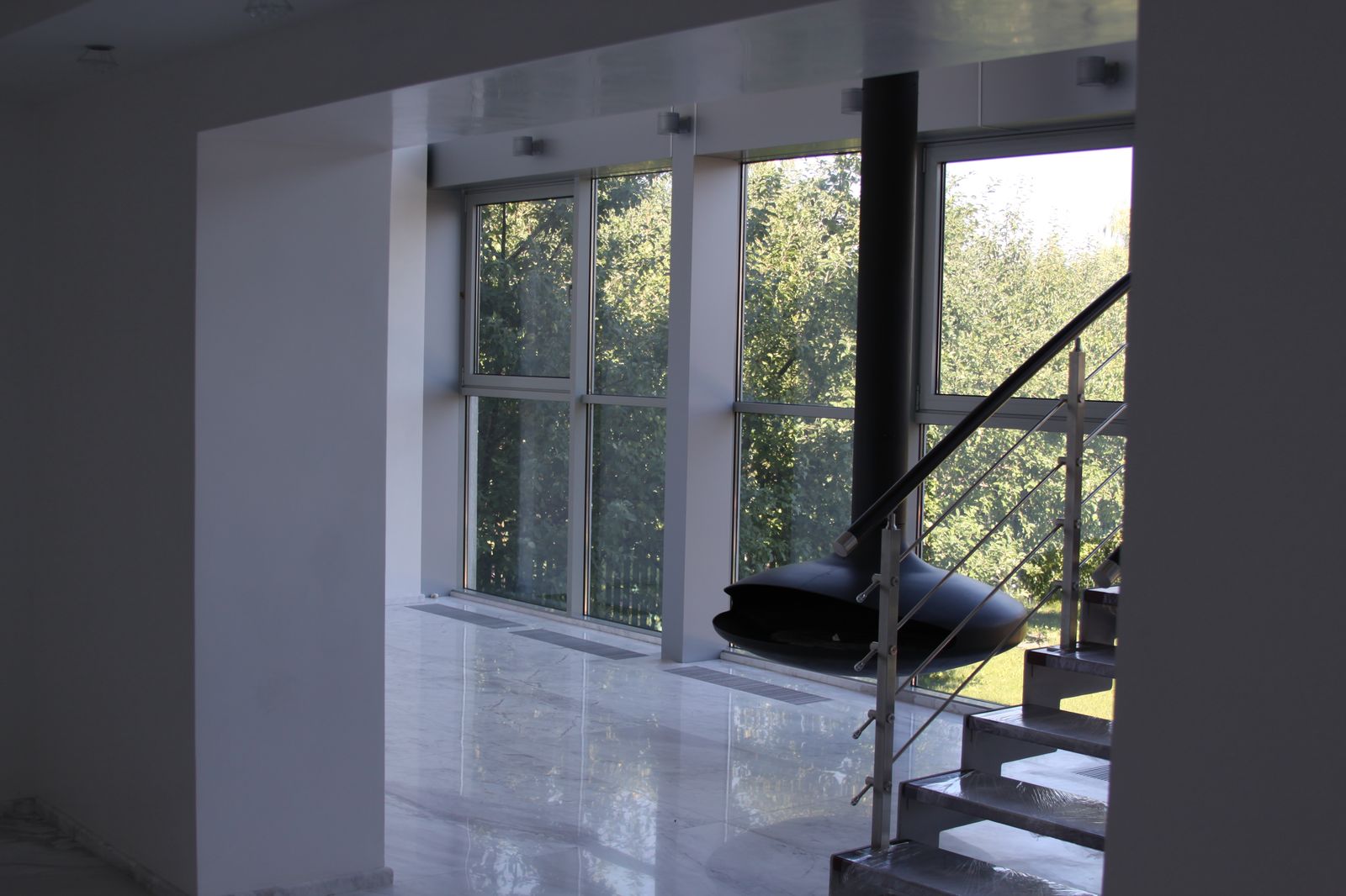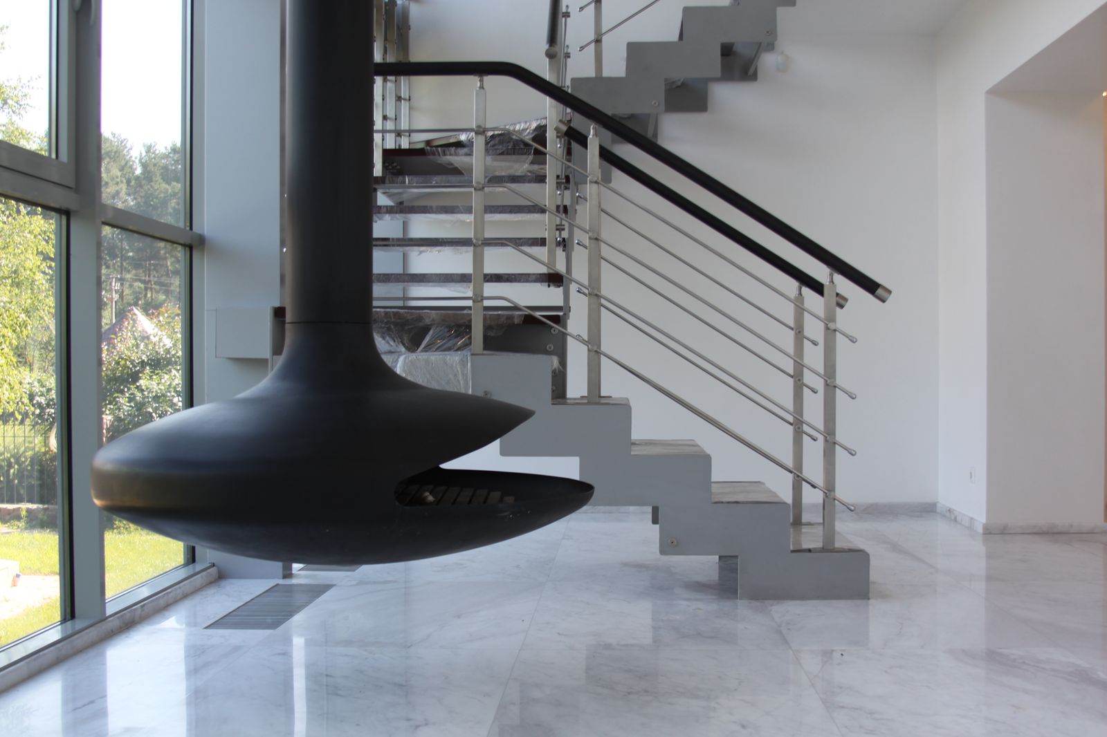 Оборудована подвесным камином ручной работы французской фирмы ФОКУС.